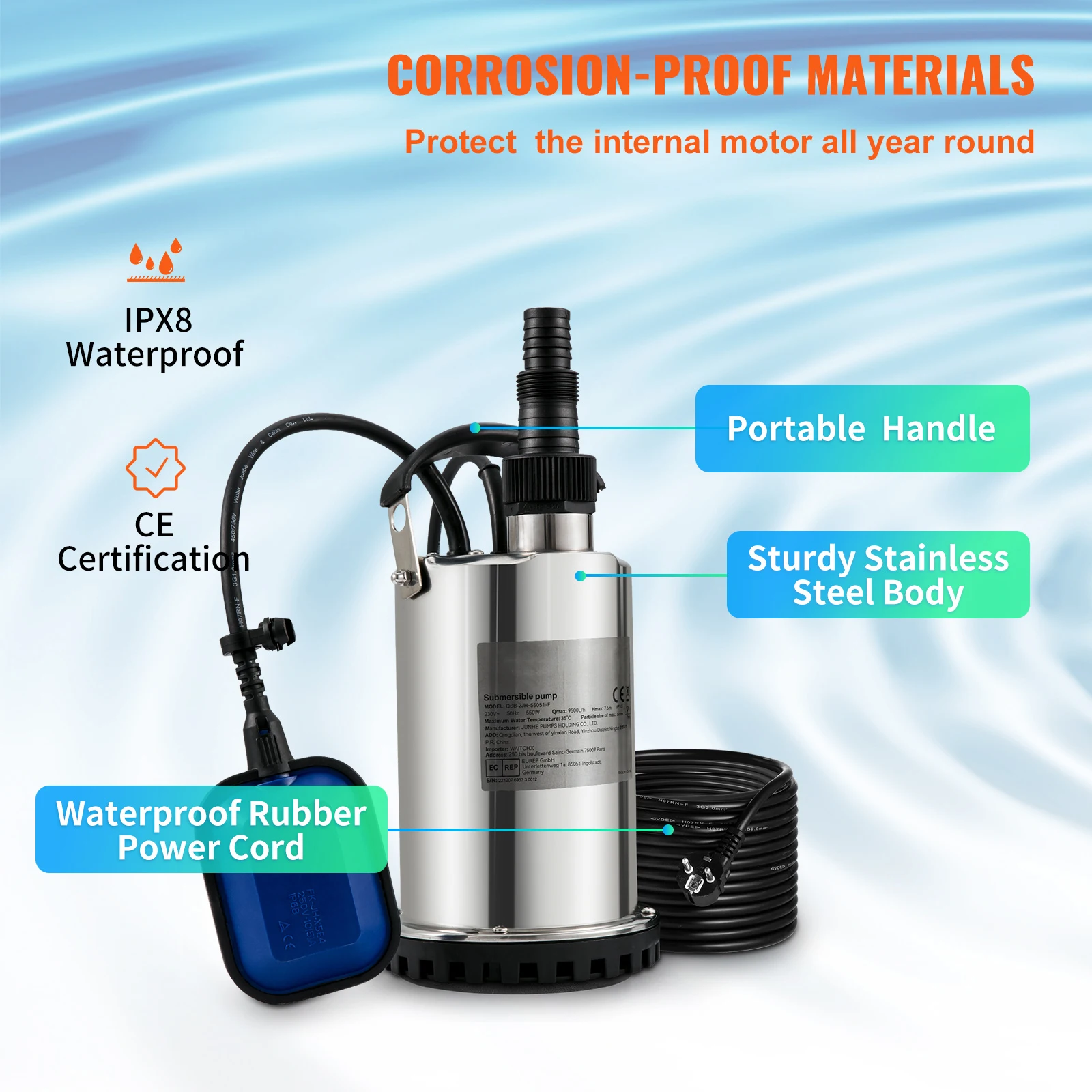Heavy-duty submersible water pump for emergency flood removal. 4 power variants 550W-2200W. Up to 1000L/min. EU plug 230V. For basements, pools, construction sites.